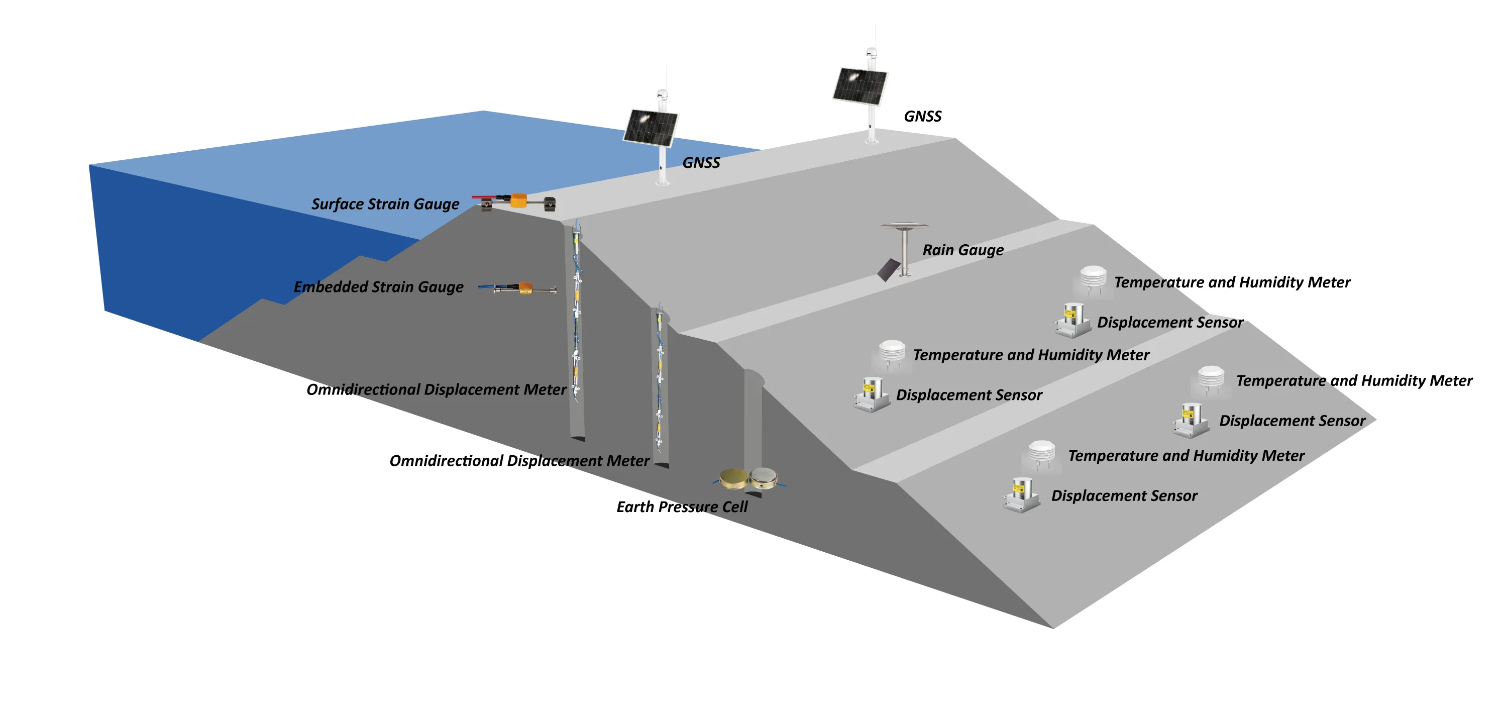 2、Gerilim ve gerinim izleme: Baraj gövdesinin beton gerilimini (ağırlıklı barajların baraj topuğu ve baraj ayağı gibi gerilimin yoğunlaştığı alanlar), baraj gövdesinin gerilimini (baraj tepesi ve kemer barajlarının baraj ayağı), baraj temel kaya kütlesinin gerilimini ve kesme duvarının gerilimini vb. içerir.